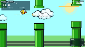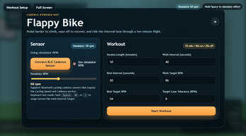 Flappy Bird HIIT is a cadence-powered interval training game built for indoor cycling. Instead of tapping a screen, you control the bird by pedaling faster or slower. Stay in the target lane during work intervals, recover during rest intervals, and try to score perfect passes for bonus points.